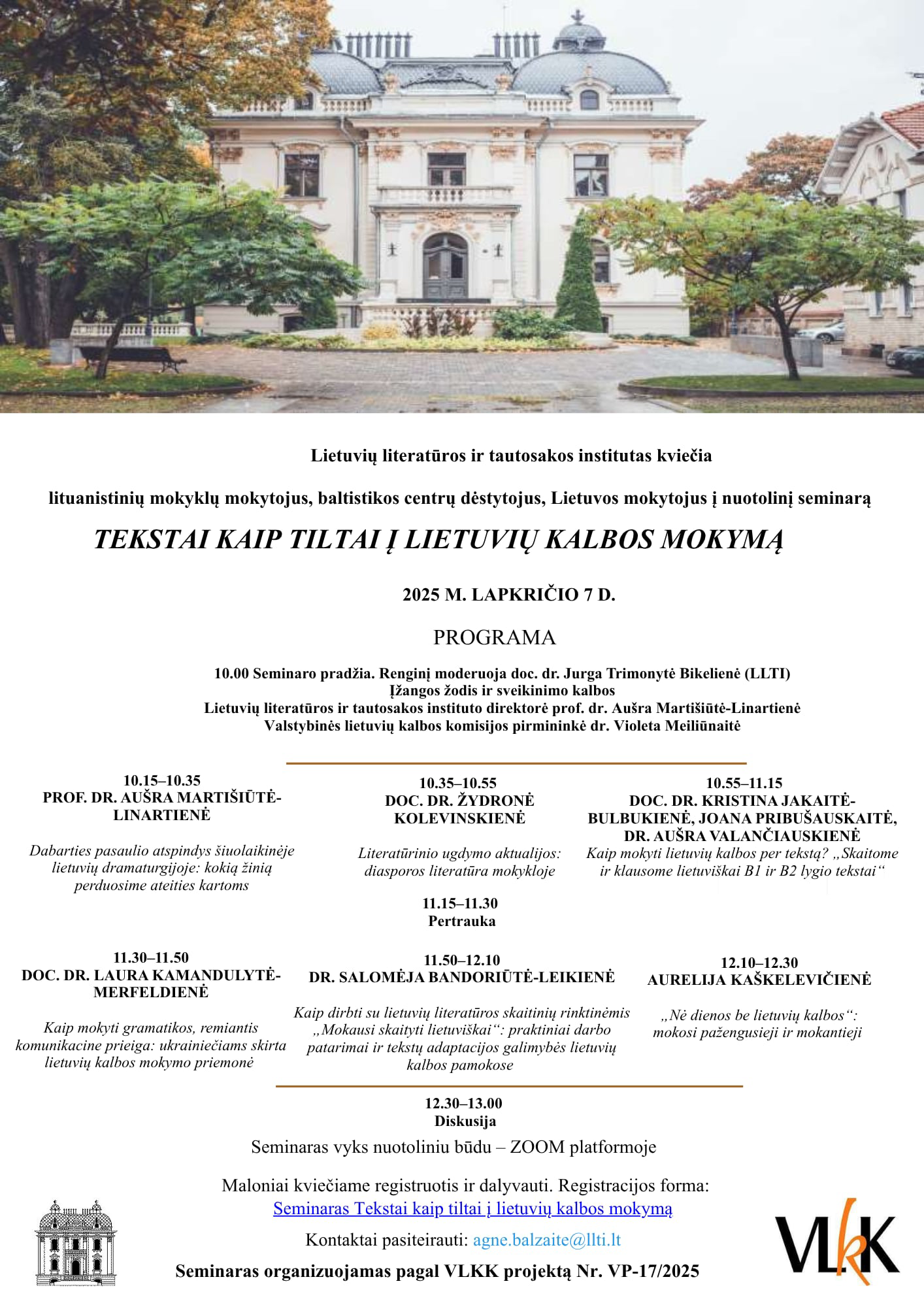 2025 m. lapkričio 7 d. kviečiame lituanistinių mokyklų mokytojus, baltistikos centrų dėstytojus, Lietuvos mokytojus į nuotolinį seminarą „Tekstai kaip tiltai į lietuvių kalbos mokymą“. Renginį moderuoja doc. dr. Juga Trimonytė Bikelienė (LLTI), įžangos žodį ir sveikinimo kalbą tars Lietuviu literaturos ir tautosakos instituto direktorė prof. dr. Aušra Martišiūtė-Linartienė, Valstybinės lietuvių kalbos komisijos pirmininkė dr. Violeta Meiliunaitė.