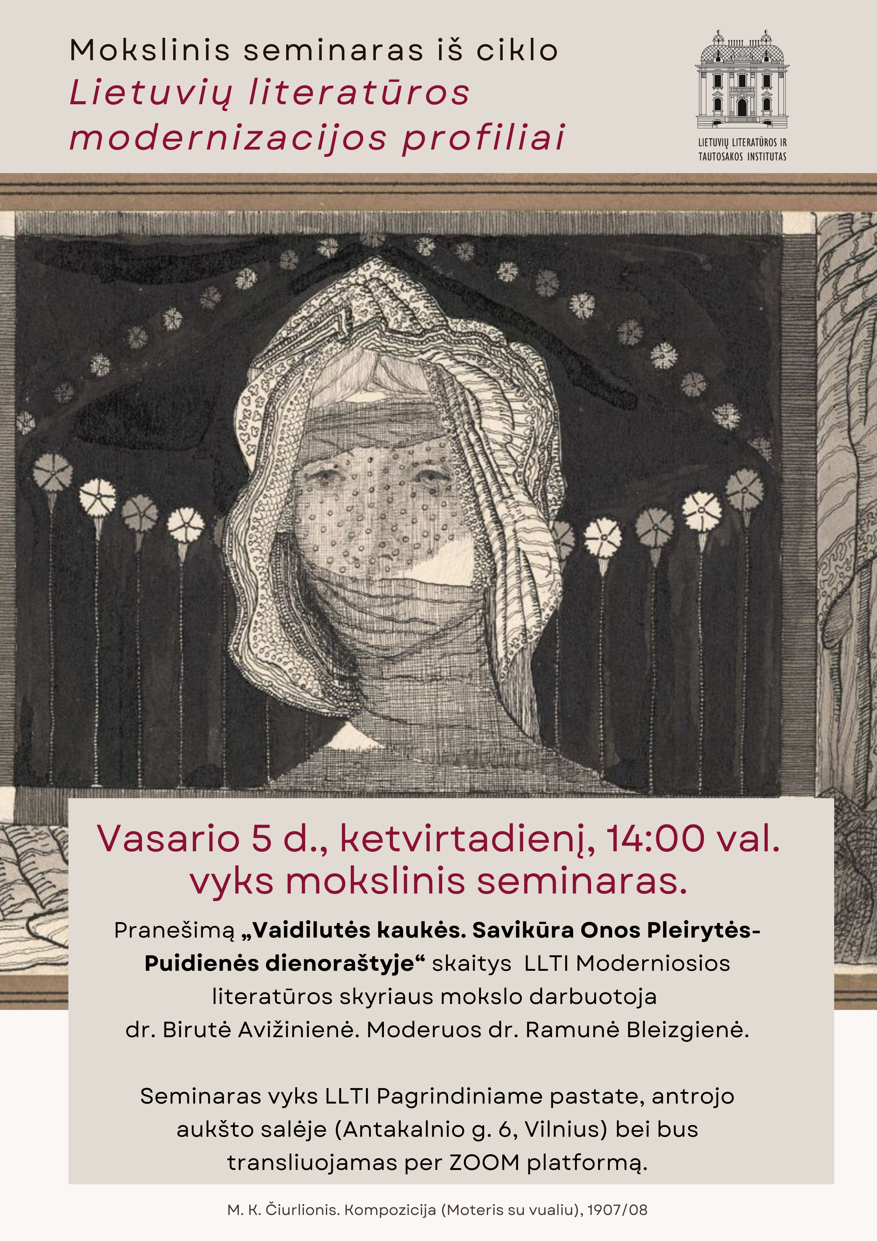 2026 m. vasario 5 d. 14.00 val. LLTI II a. salėje vyks mokslinis seminaras „Vaidilutės kaukės. Savikūra Onos Pleirytės-Puidienės dienoraštyje“ iš seminarų ciklo „Lietuvių literatūros modernizacijos profiliai“. Pranešimą skaitys dr. Birutė Avižinienė, moderuos dr. Ramunė Bleizgienė.